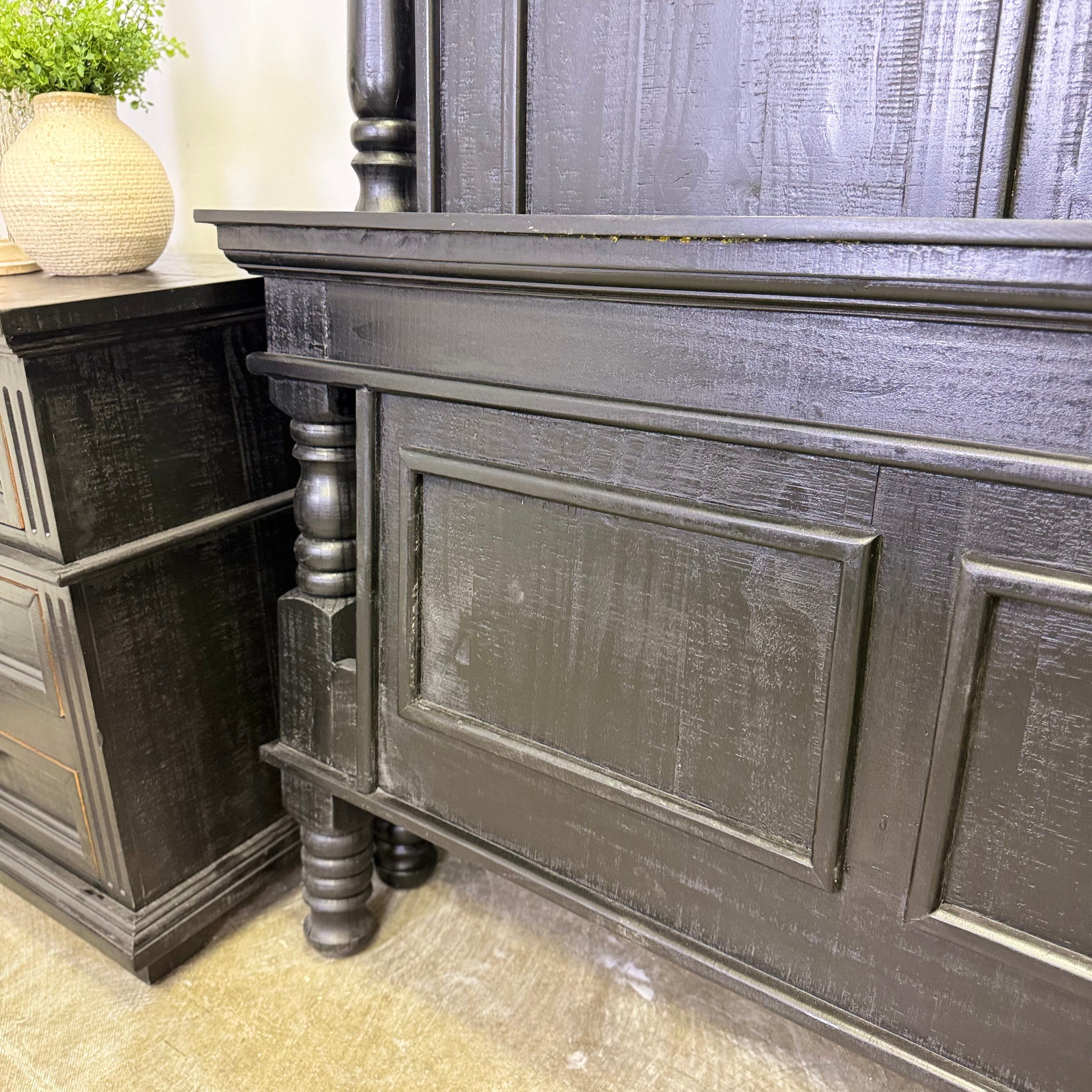 Those turned posts add weight without feeling fussy. The paneled footboard grounds it. The dresser carries the same architectural confidence with deep drawers framed in clean molding and dark hardware that keeps everything sharp, not sweet. 🖤