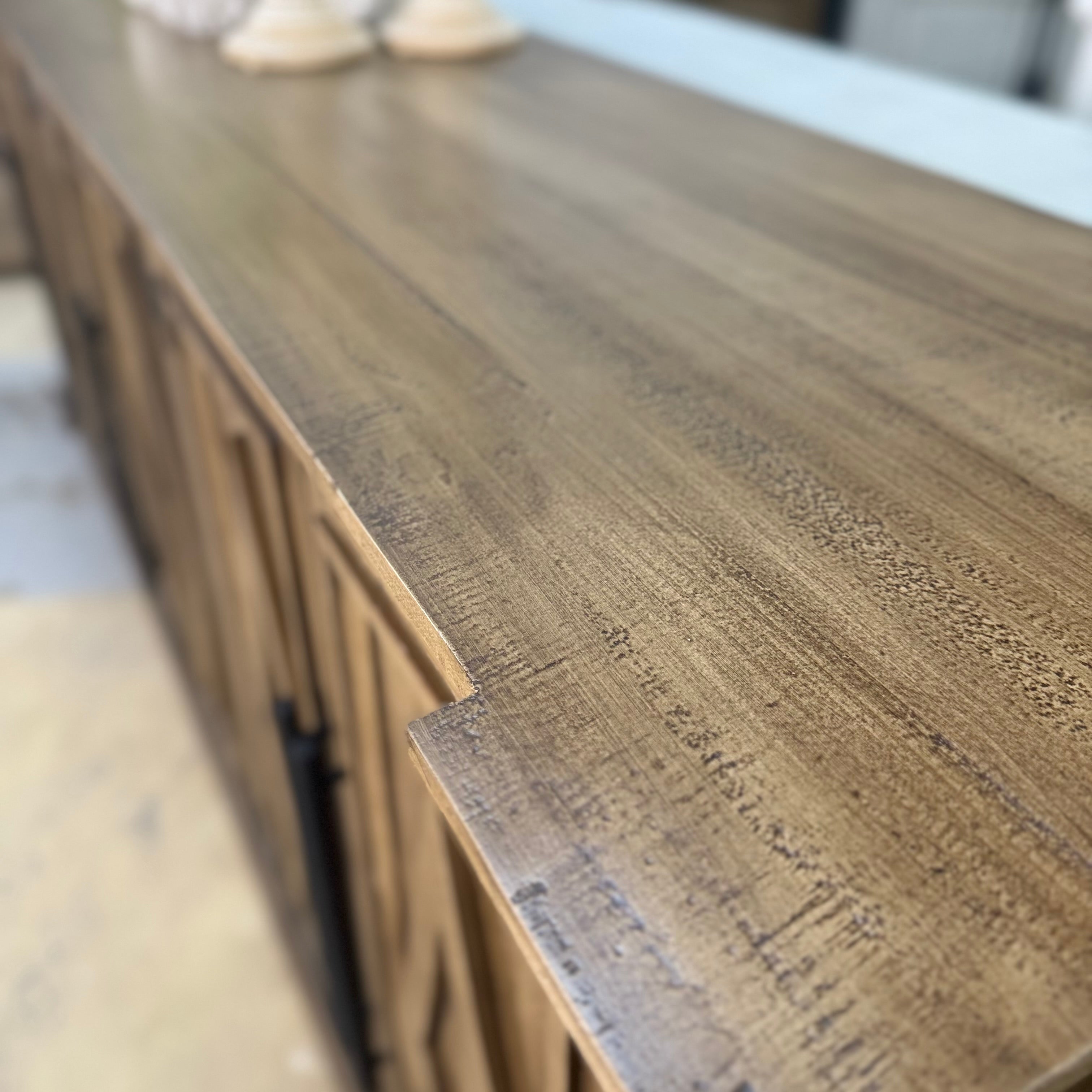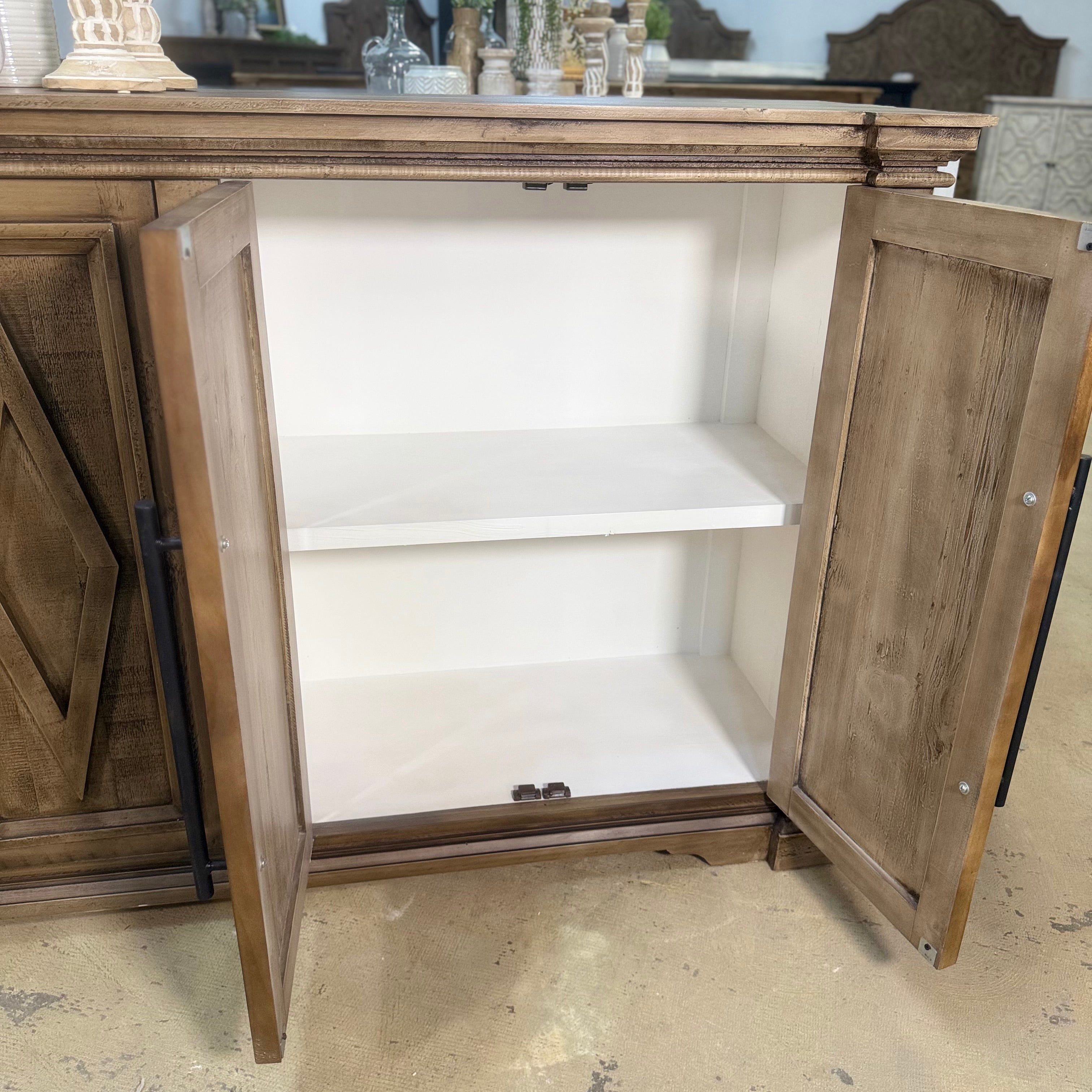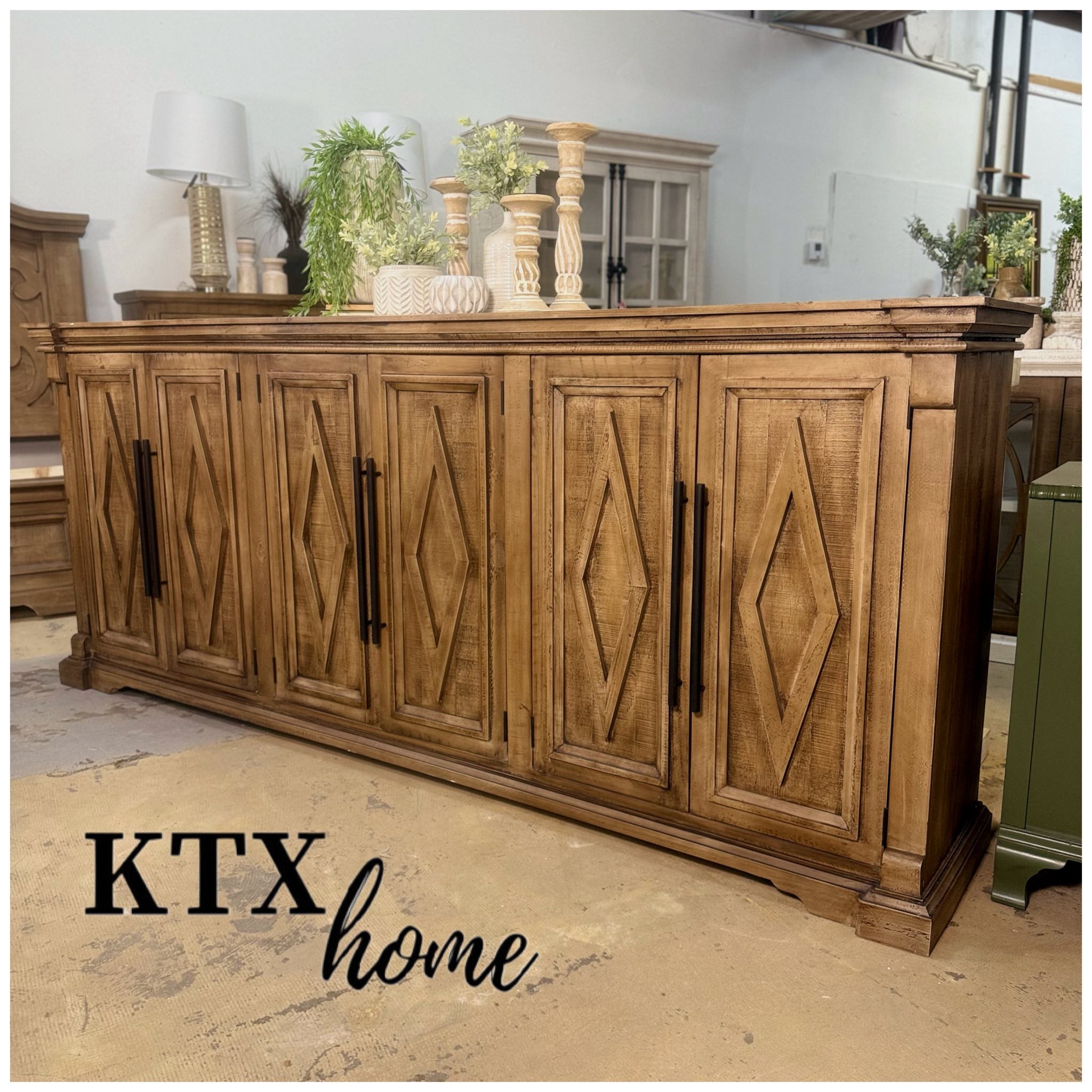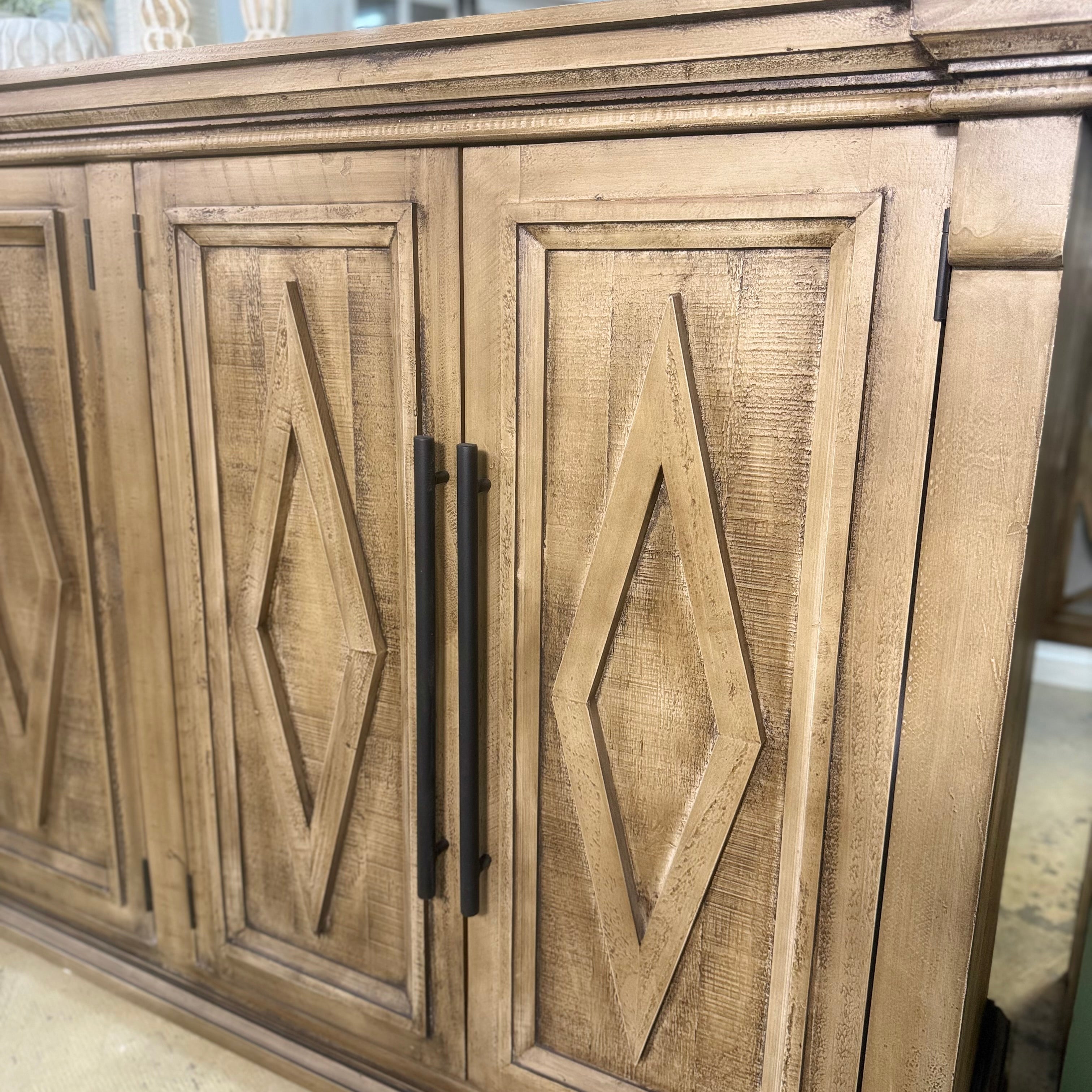This piece is giving timeless with a twist. Think rich wood tones, clean design, and quality that lasts way longer than your current obsession with pumpkin spice. Add in those bold diamond-carved doors, sleek black hardware, and storage for days, it’s basically functional art for your home. Perfect for dining rooms, living rooms, or anywhere that deserves a glow-up.