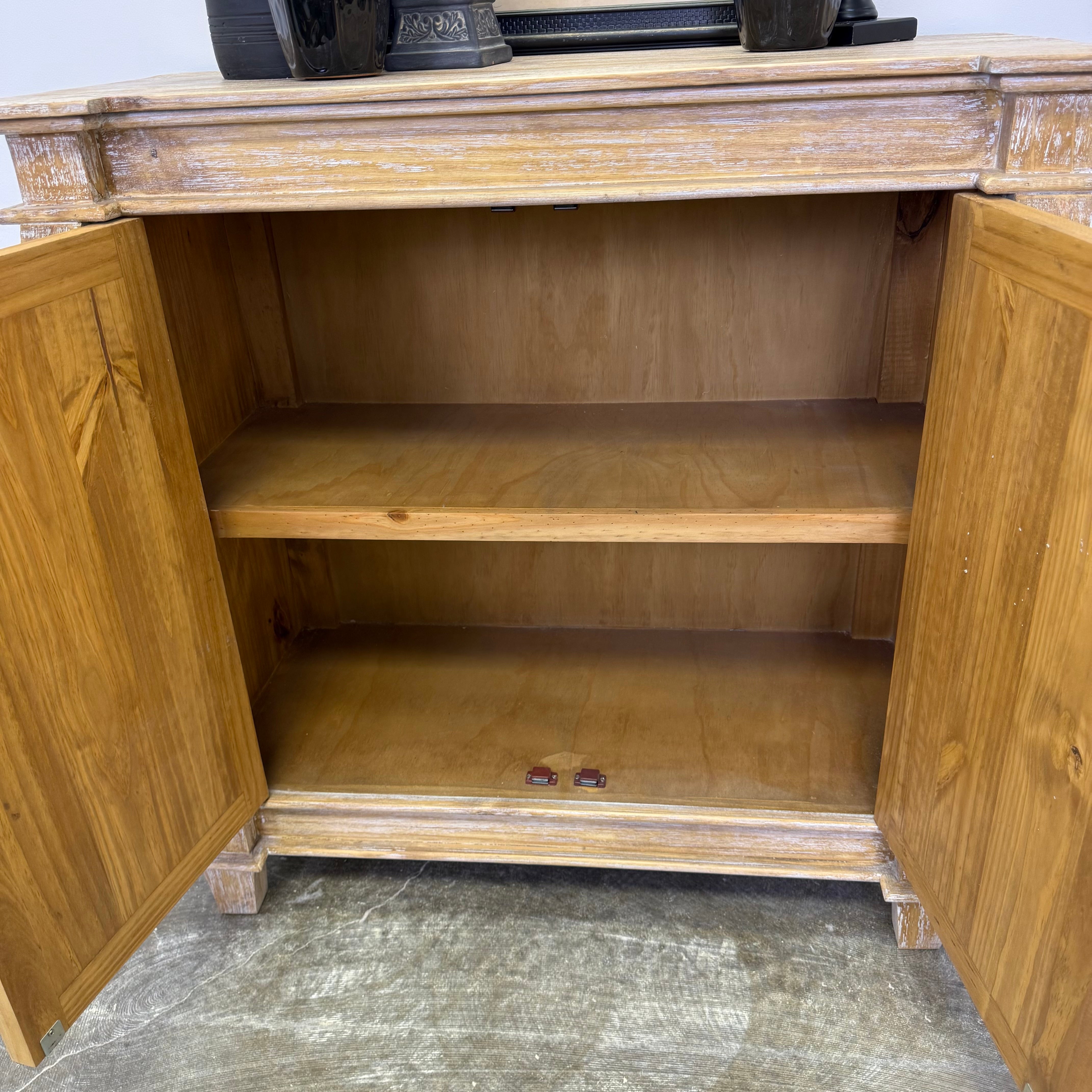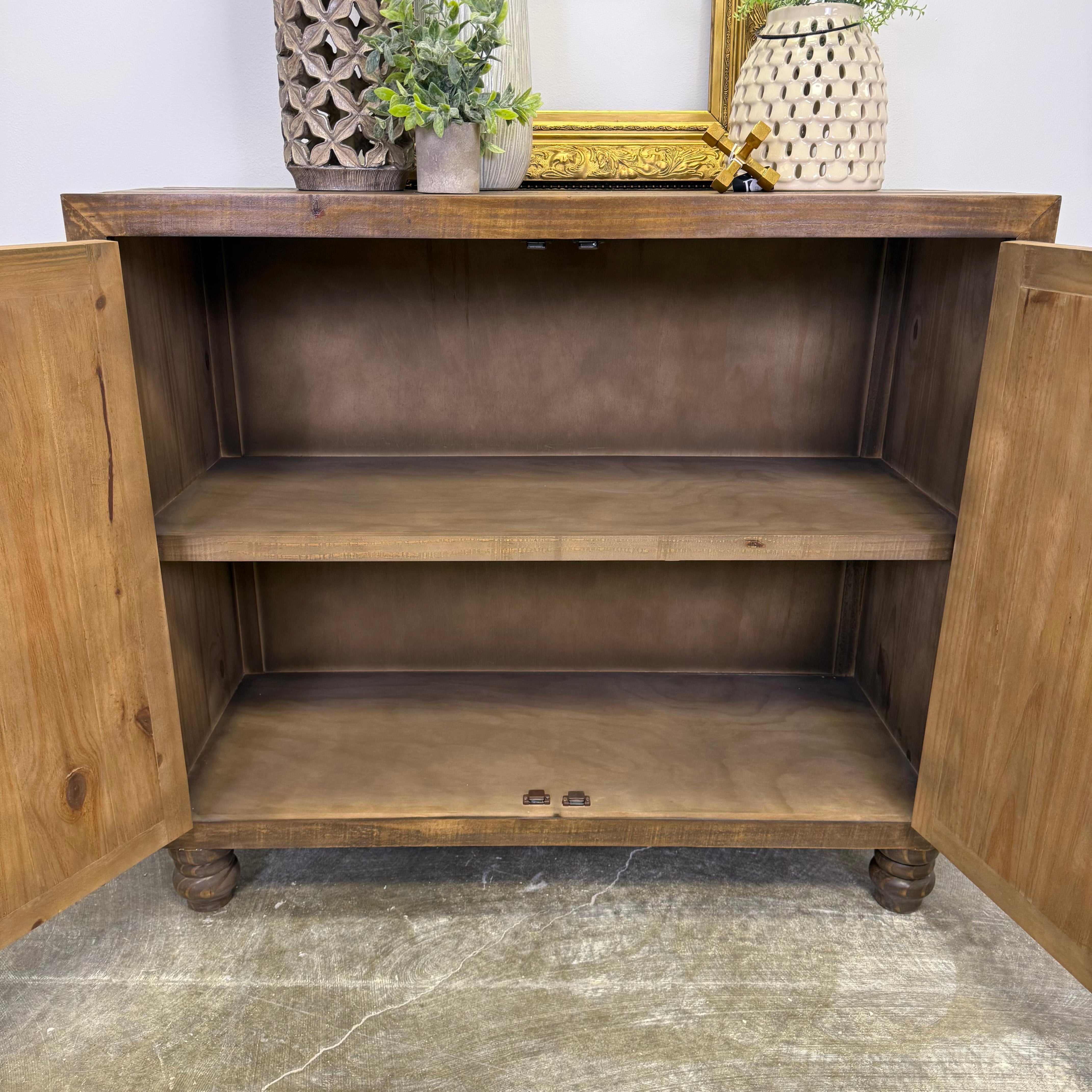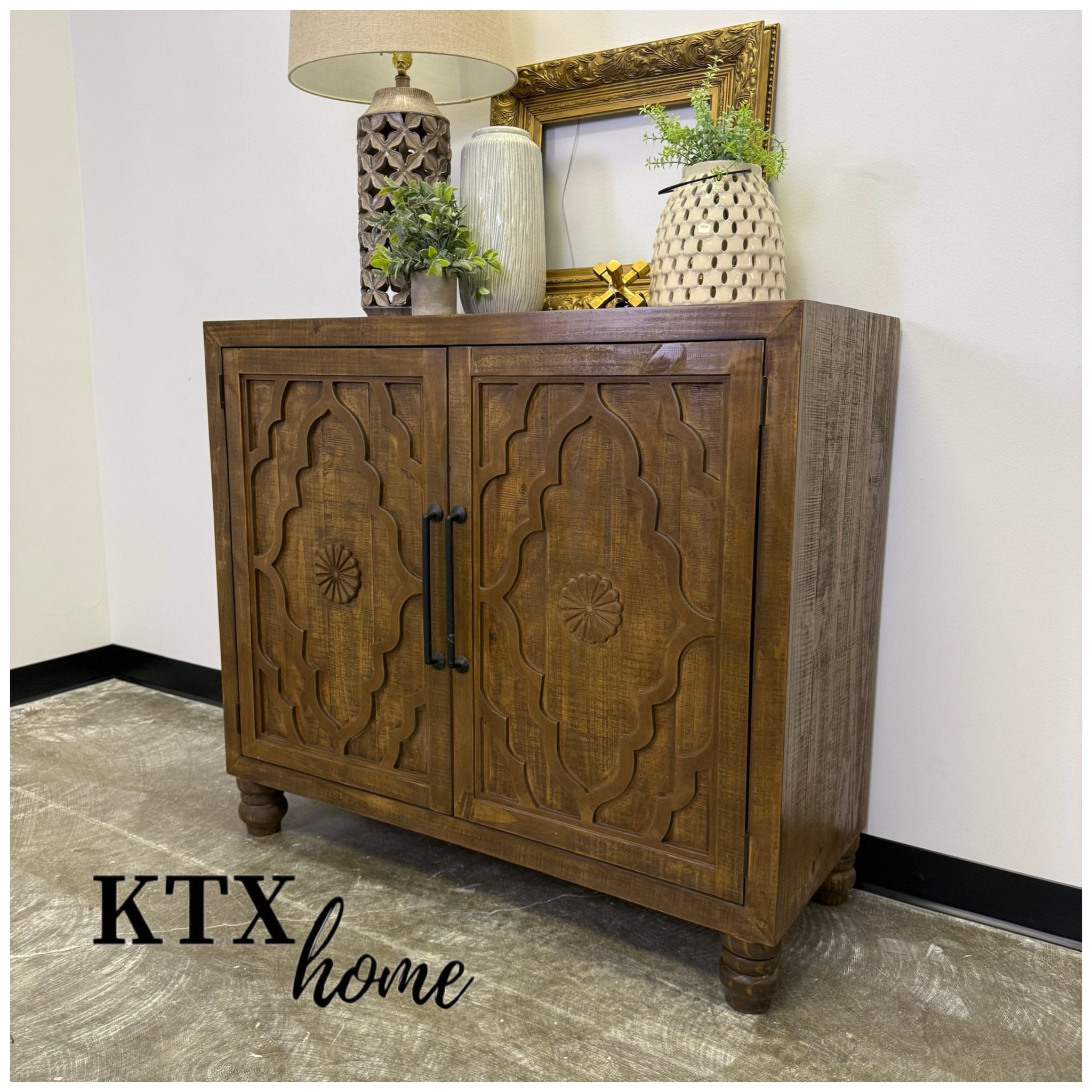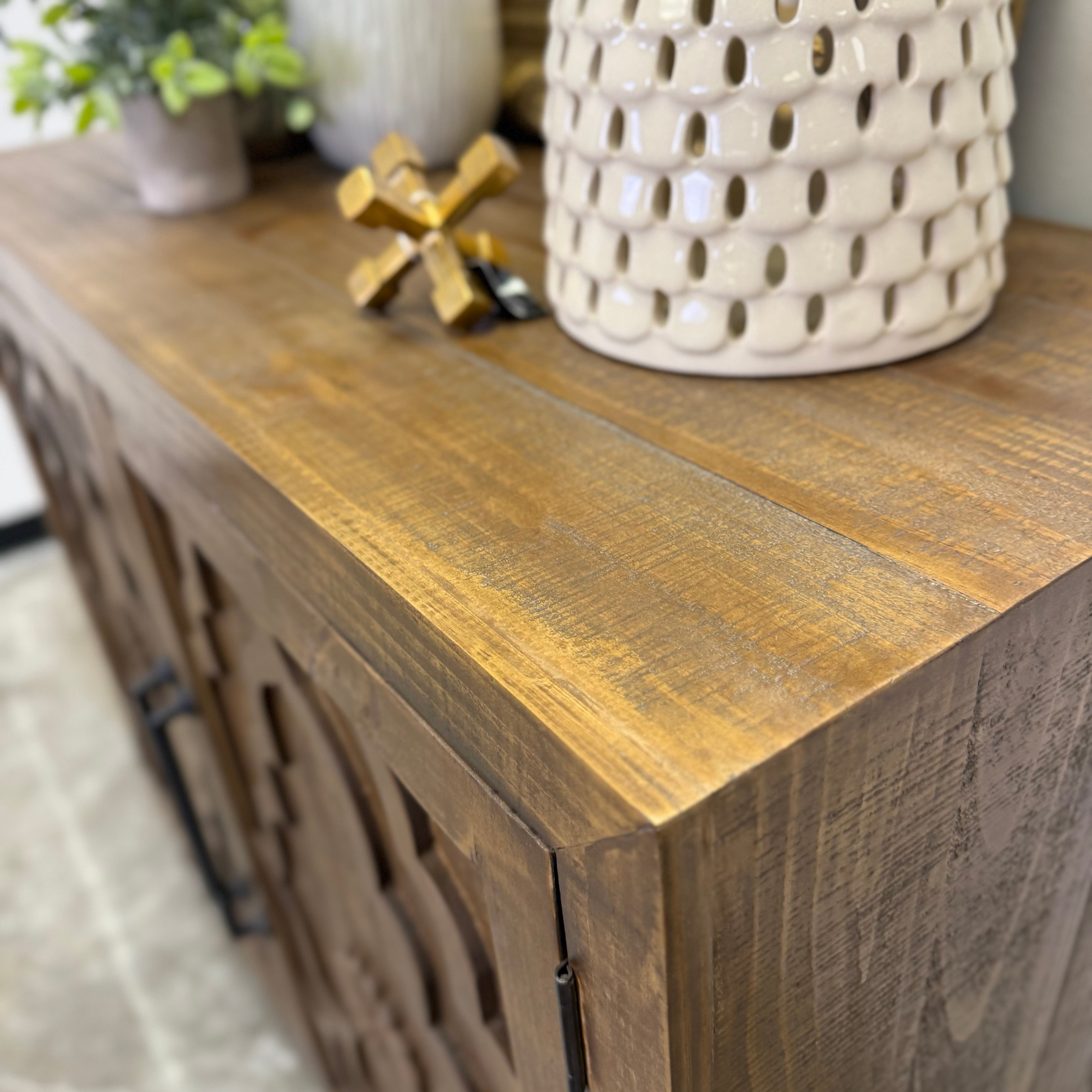 The hand-carved door fronts steal the show here. Detailed, dimensional, and full of character, they add an architectural rhythm that gives the piece instant presence. Balanced by clean lines and dark hardware, the look feels worldly, intentional, and very grown.
