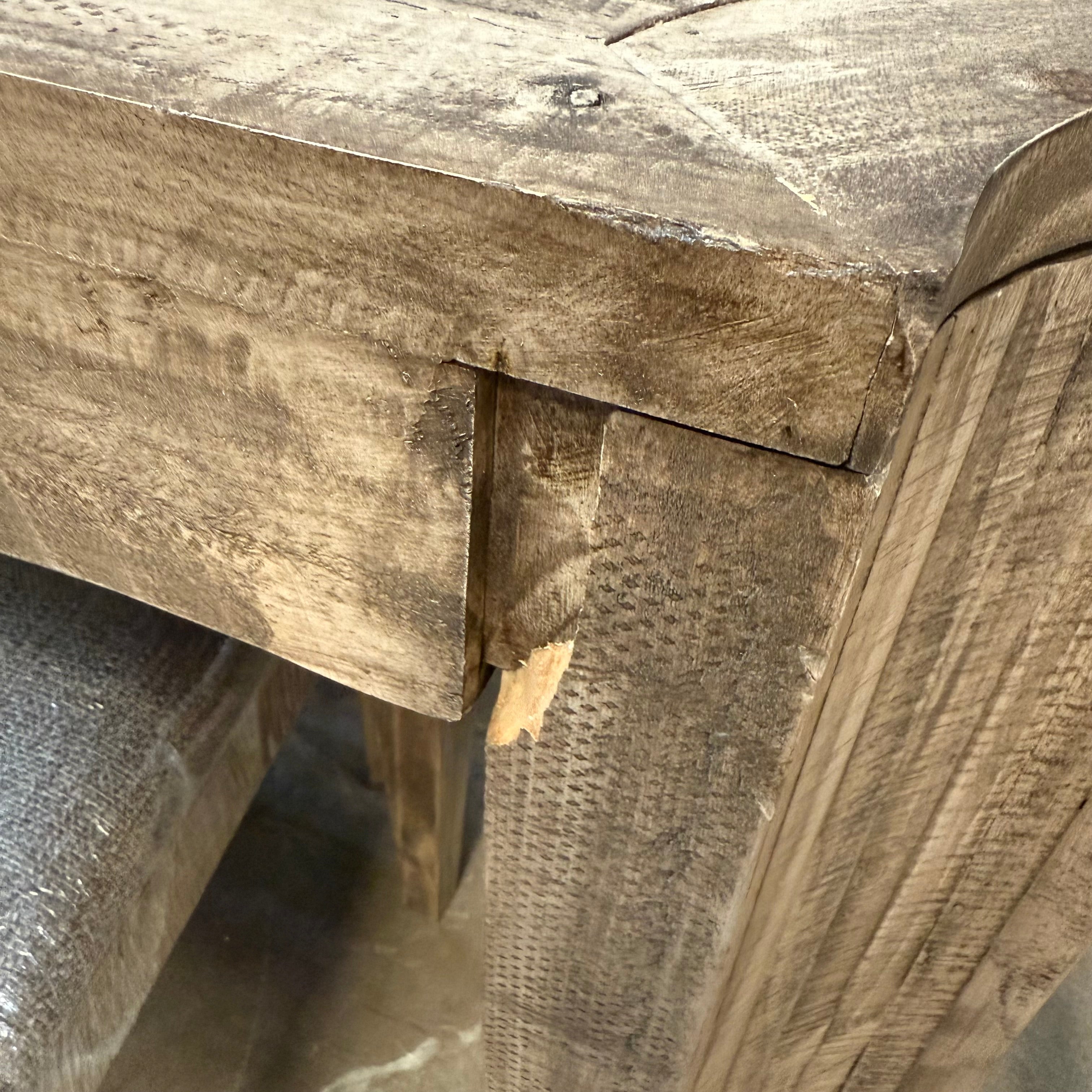 AS-IS The table has a couple spots where a corner of the leg broke. It does not affect the structure or function of the table. We have the broken sections, they can be glued back on. See detail photos.